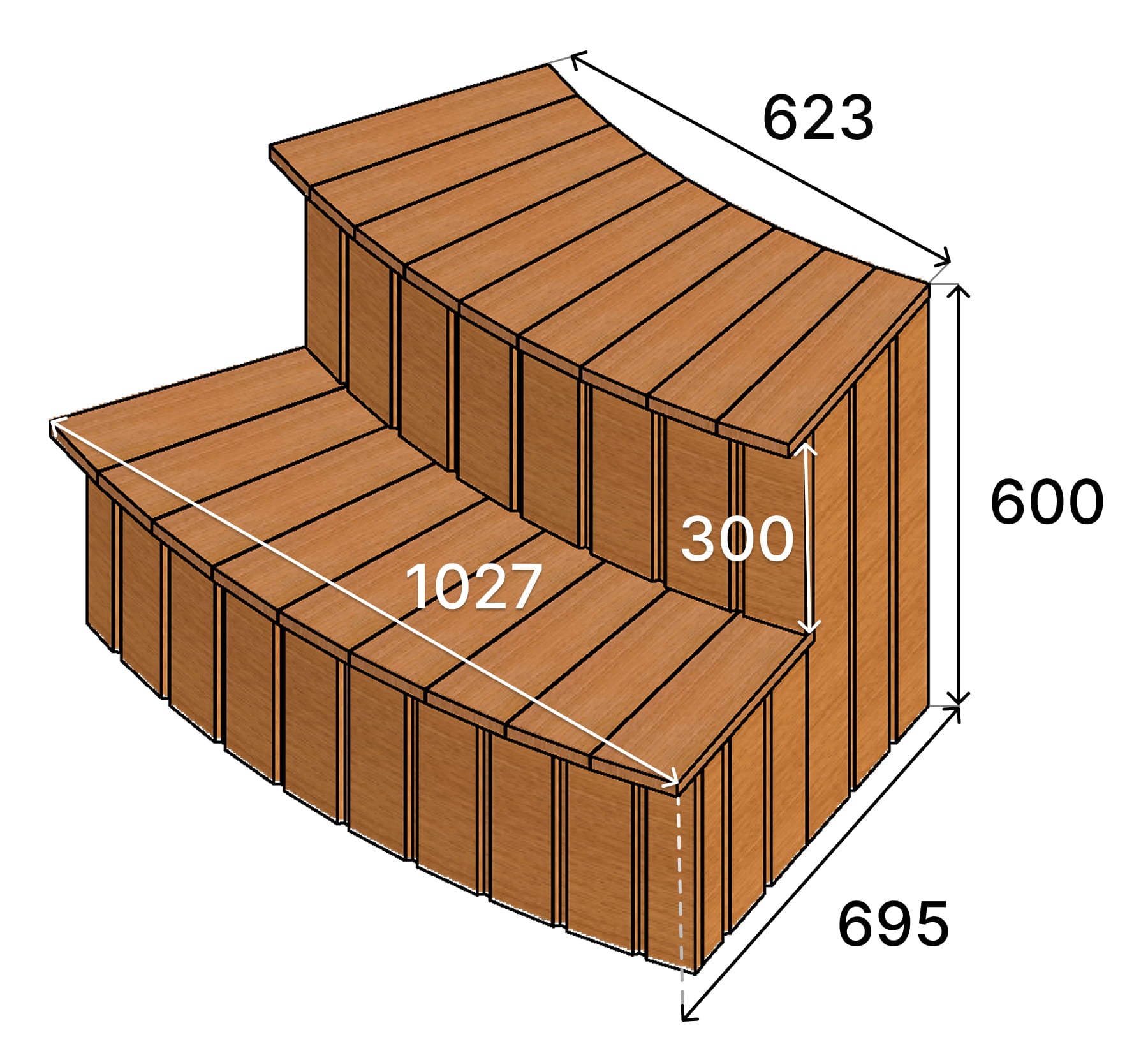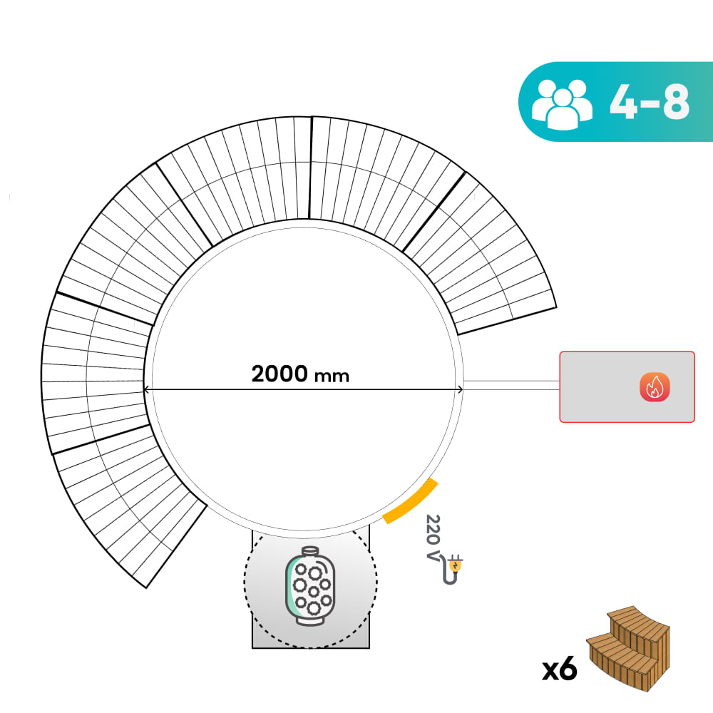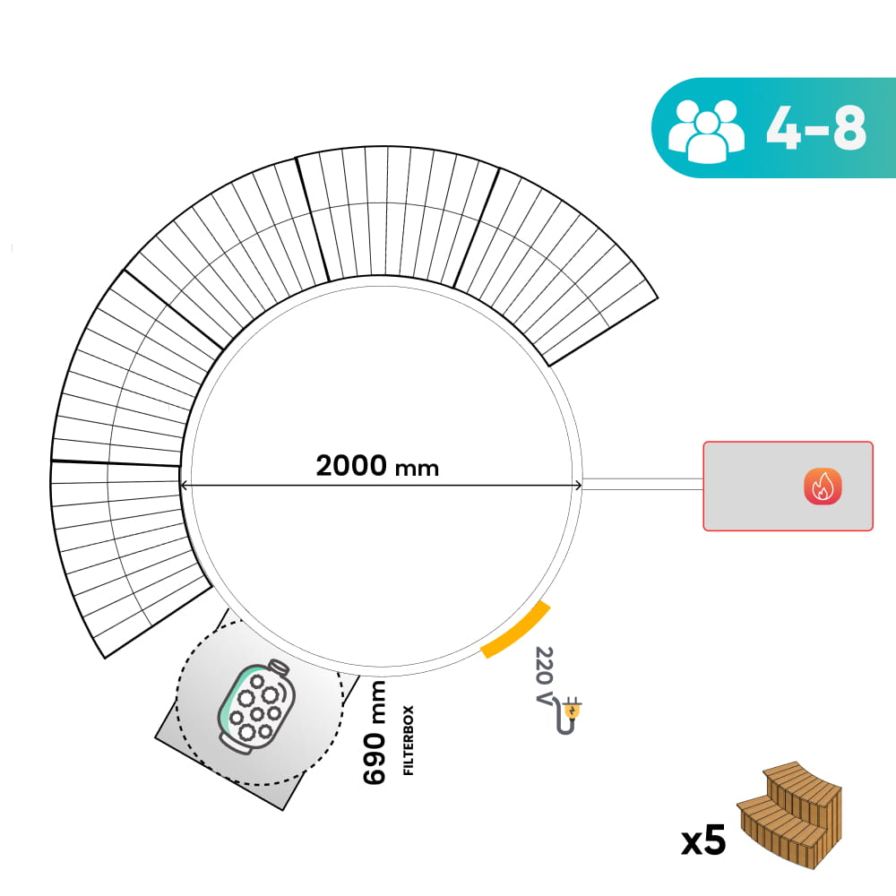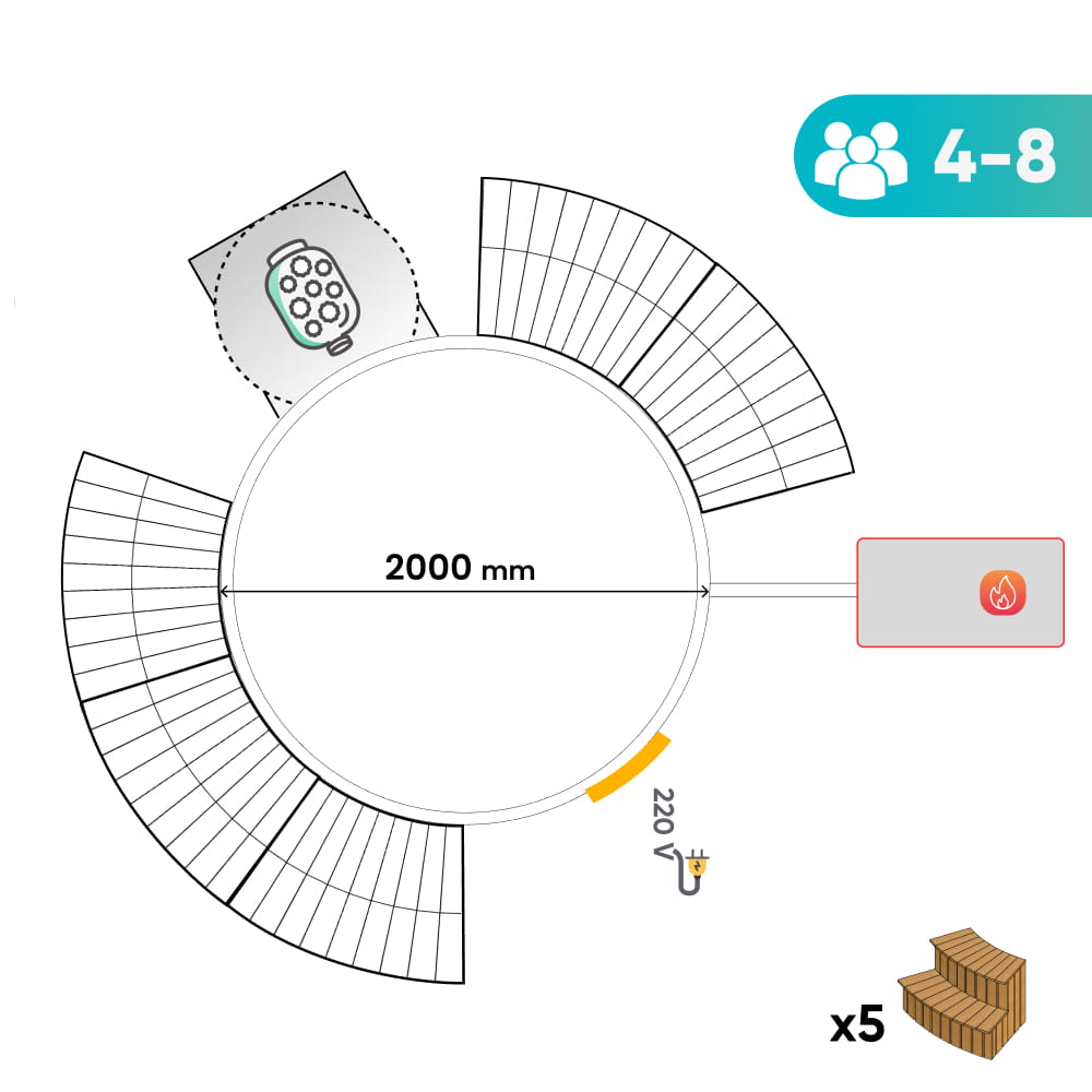 Plně opláštěné modulární schody — uspořádání kolem koupacího sudu a rozměry