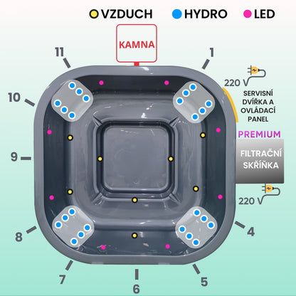 Čtvercový koupací sud | externí kamna | písková filtrace s UV-C lampou | 16 hydromasážních trysek | pro 4–8 osob