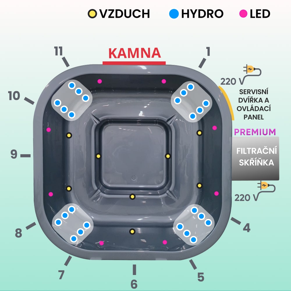 • Vzduchová masážní soustava, 8 trysek, 0,7 kW (8 040 Kč)