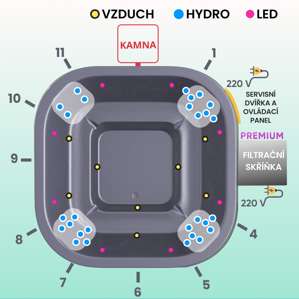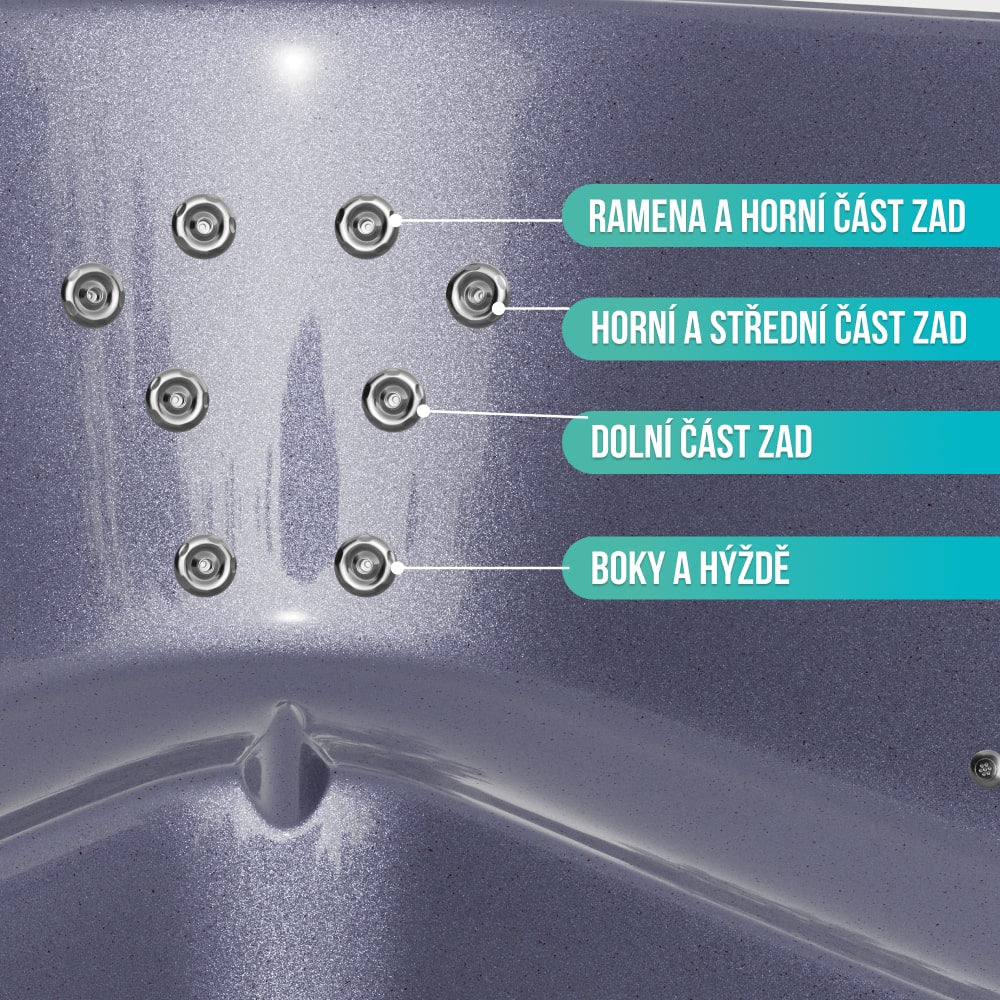 - Vzduchová masážní soustava, 8 trysek, 0,7 kW (8 040 Kč)