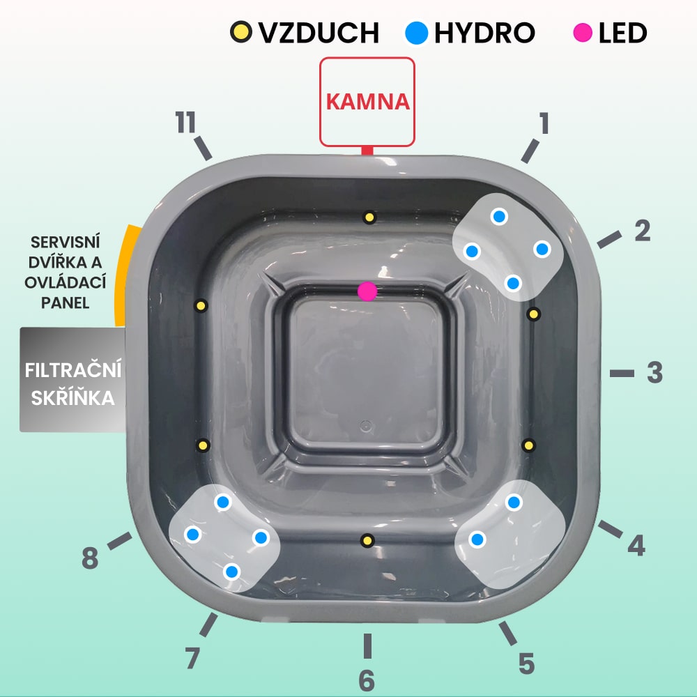 - Vzduchová masážní soustava, 6 trysek, 0,7 kW (6 858 Kč)