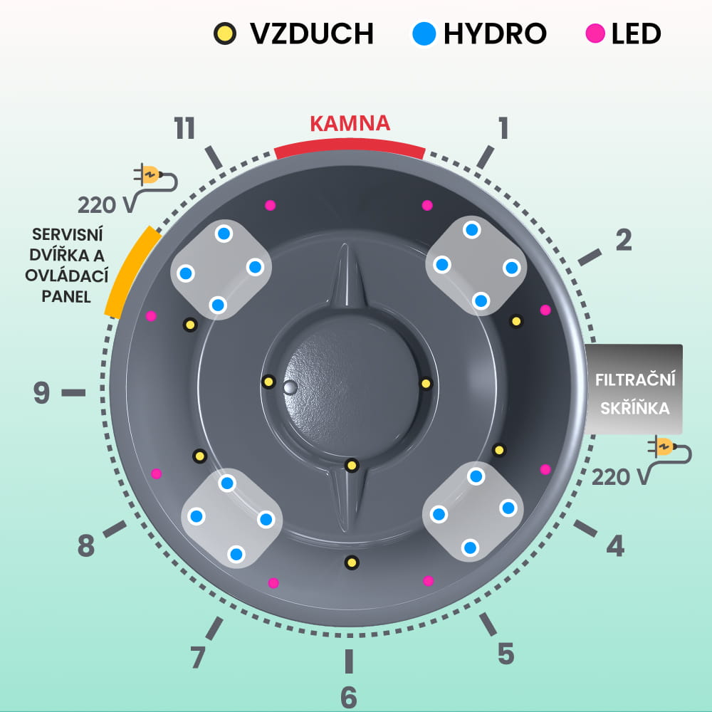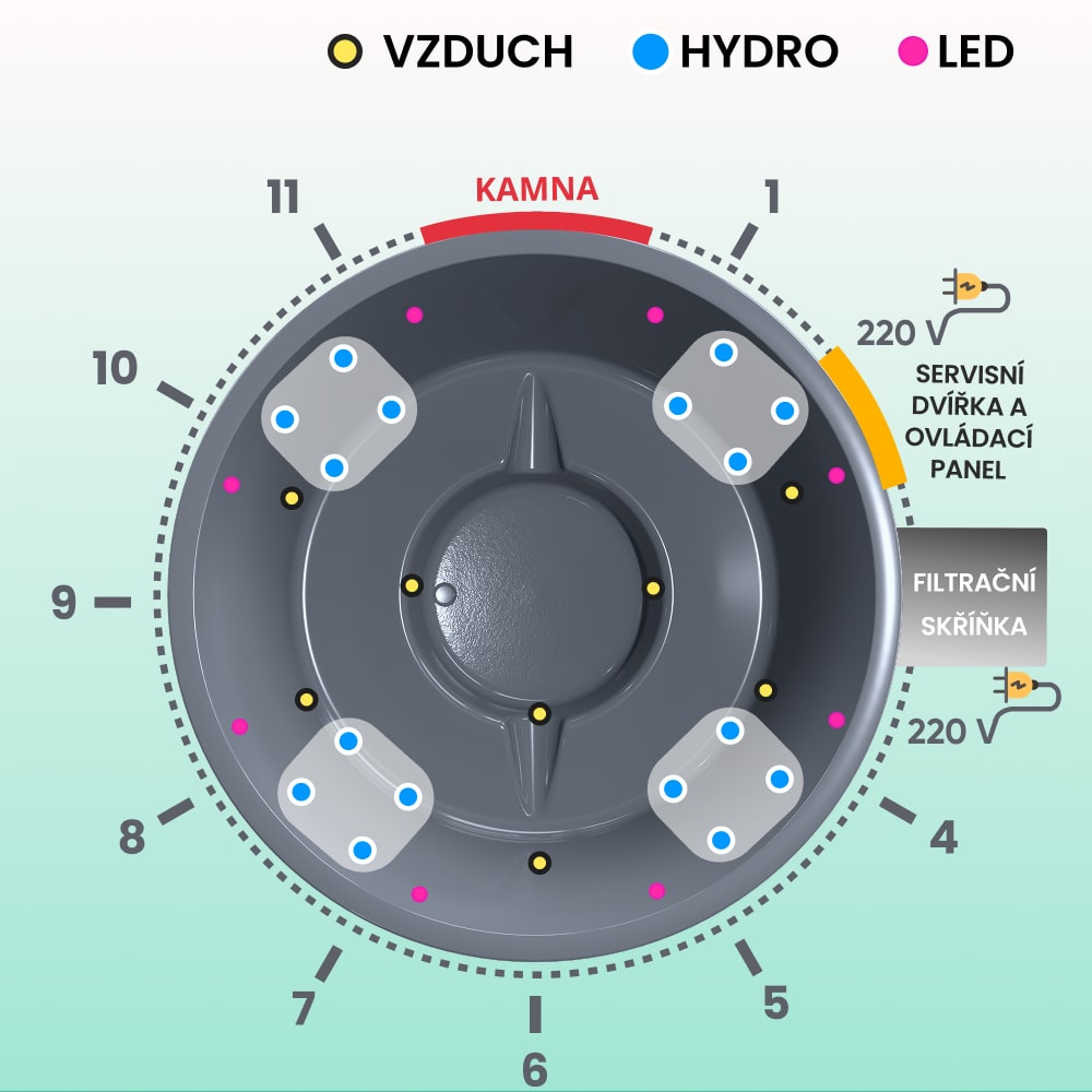- Vzduchová masážní soustava, 8 trysek, 0,7 kW (8 040 Kč)