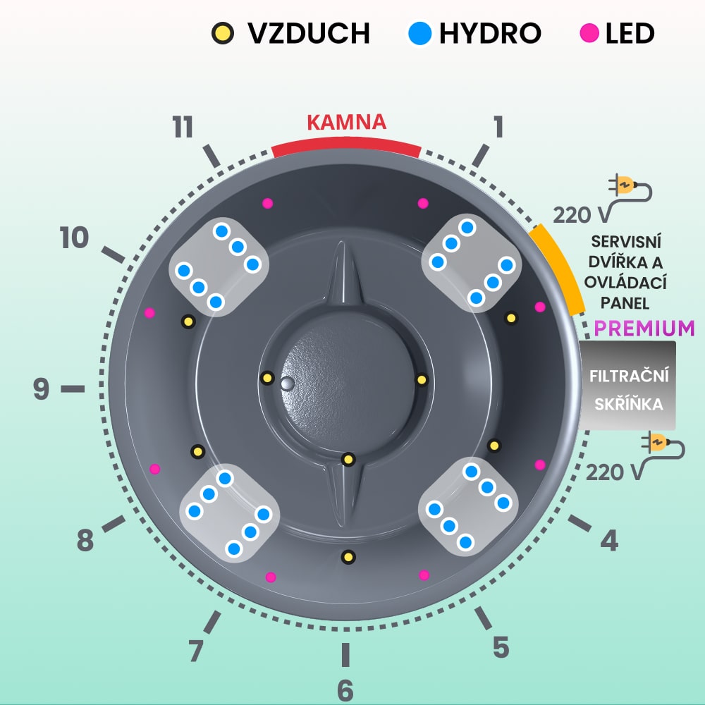 • Vzduchová masážní soustava, 8 trysek, 0,7 kW (8 040 Kč)