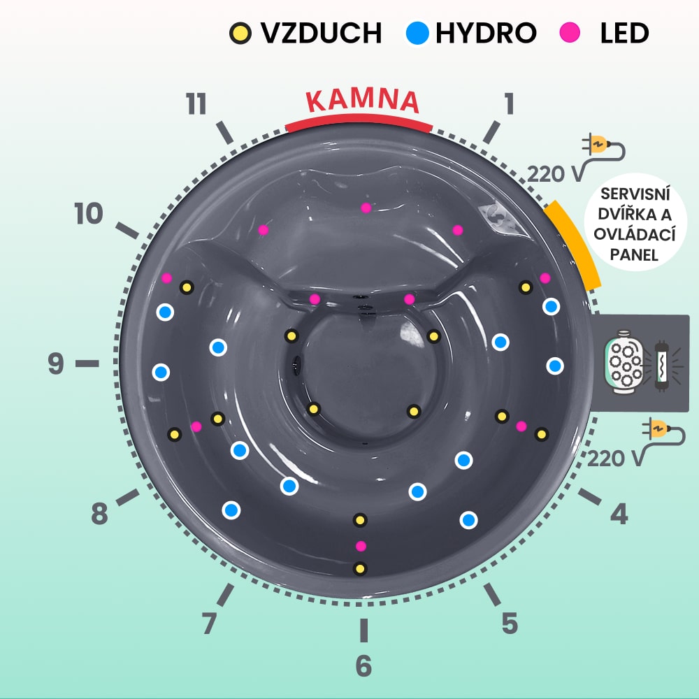 - Vzduchová masážní soustava, 12 trysek, 0,7 kW (13 715 Kč)