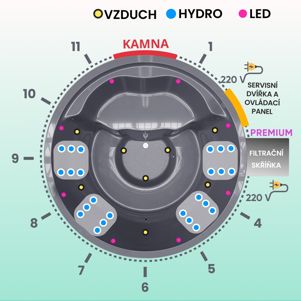 - Vzduchová masážní soustava, 8 trysek, 0,7 kW (8 040 Kč)