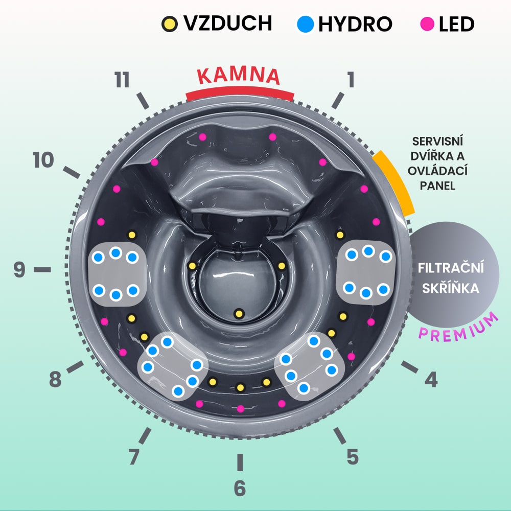 - Vzduchová masážní soustava, 12 trysek, 0,7 kW (13 715 Kč)