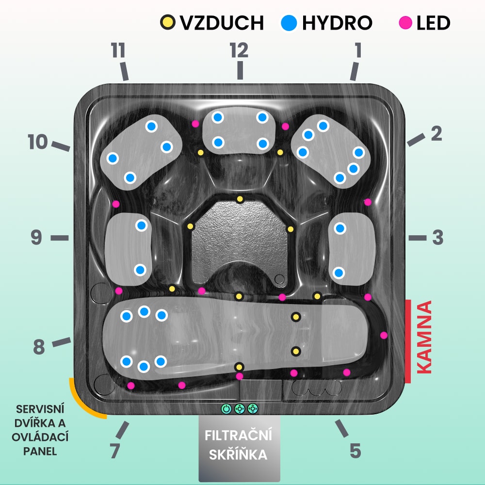 - Vzduchová masážní soustava, 11 trysek, 0,7 kW (12 468 Kč)