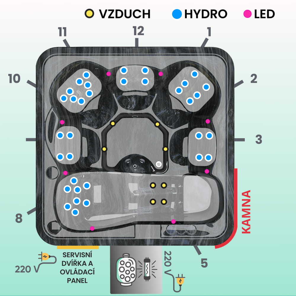 - Vzduchová masážní soustava, 8 trysek, 0,7 kW (8 040 Kč)